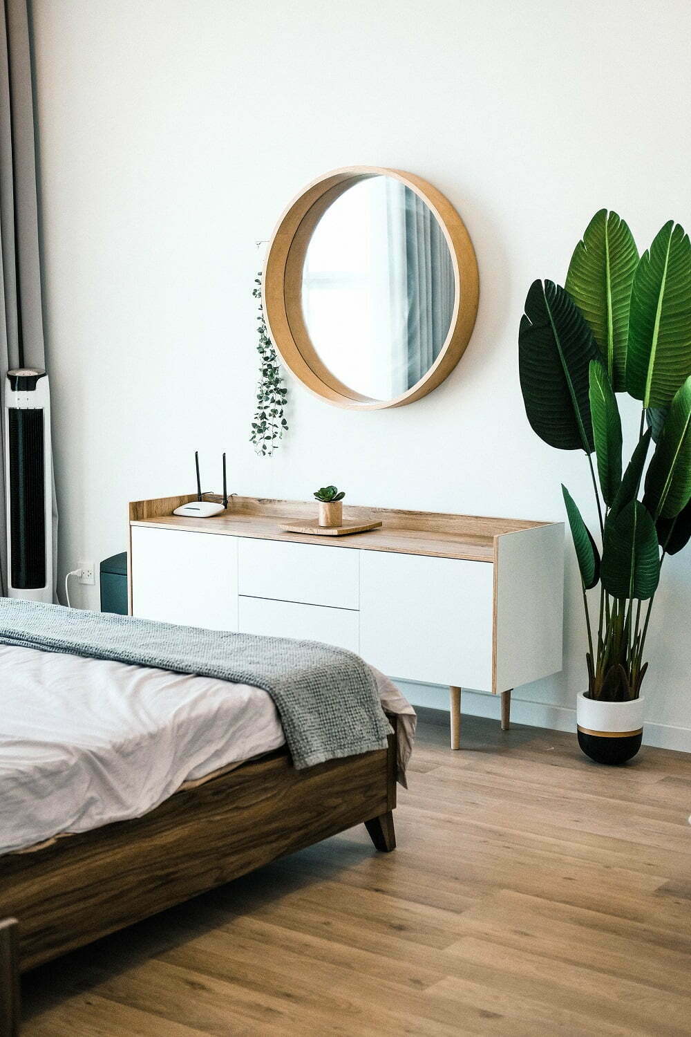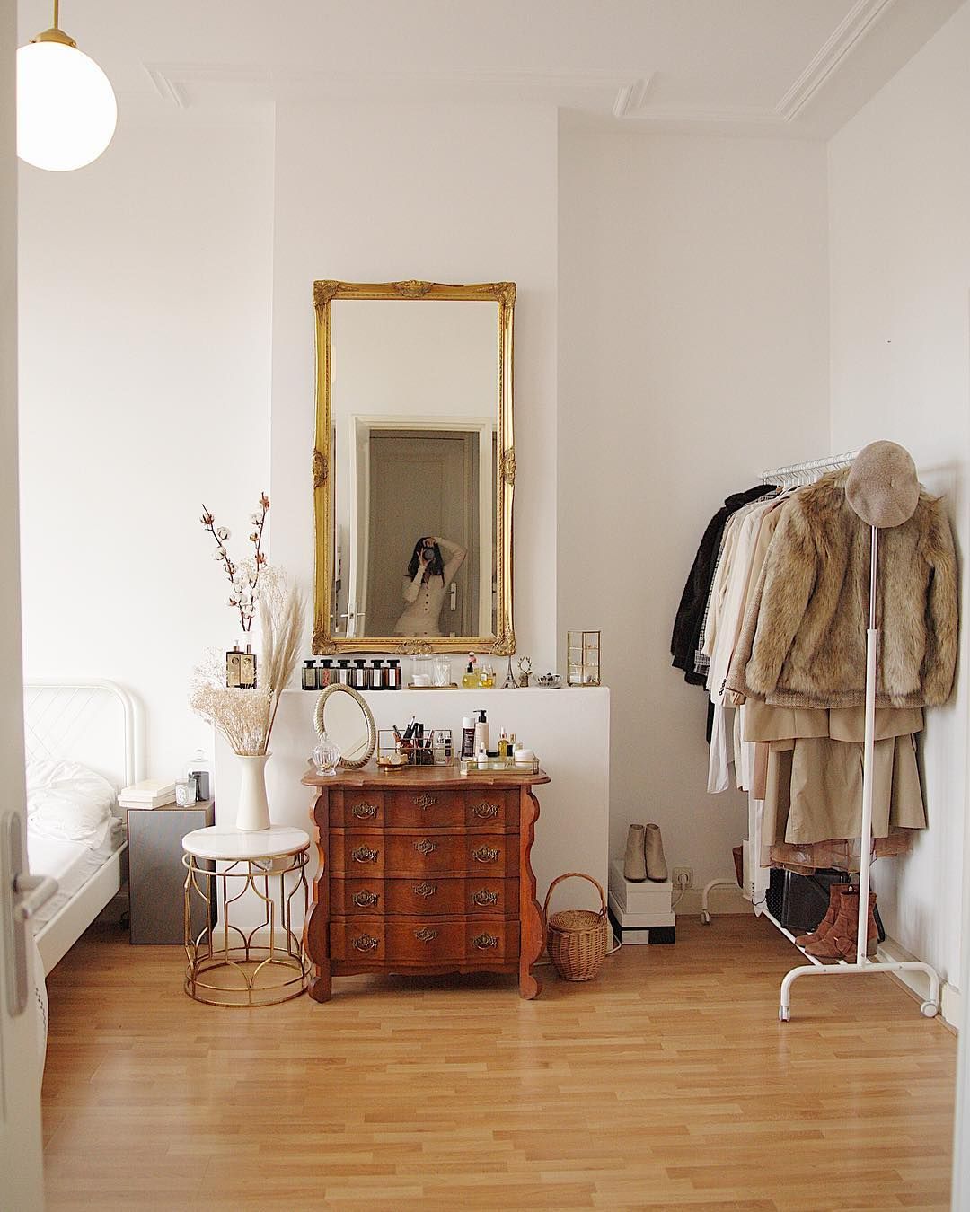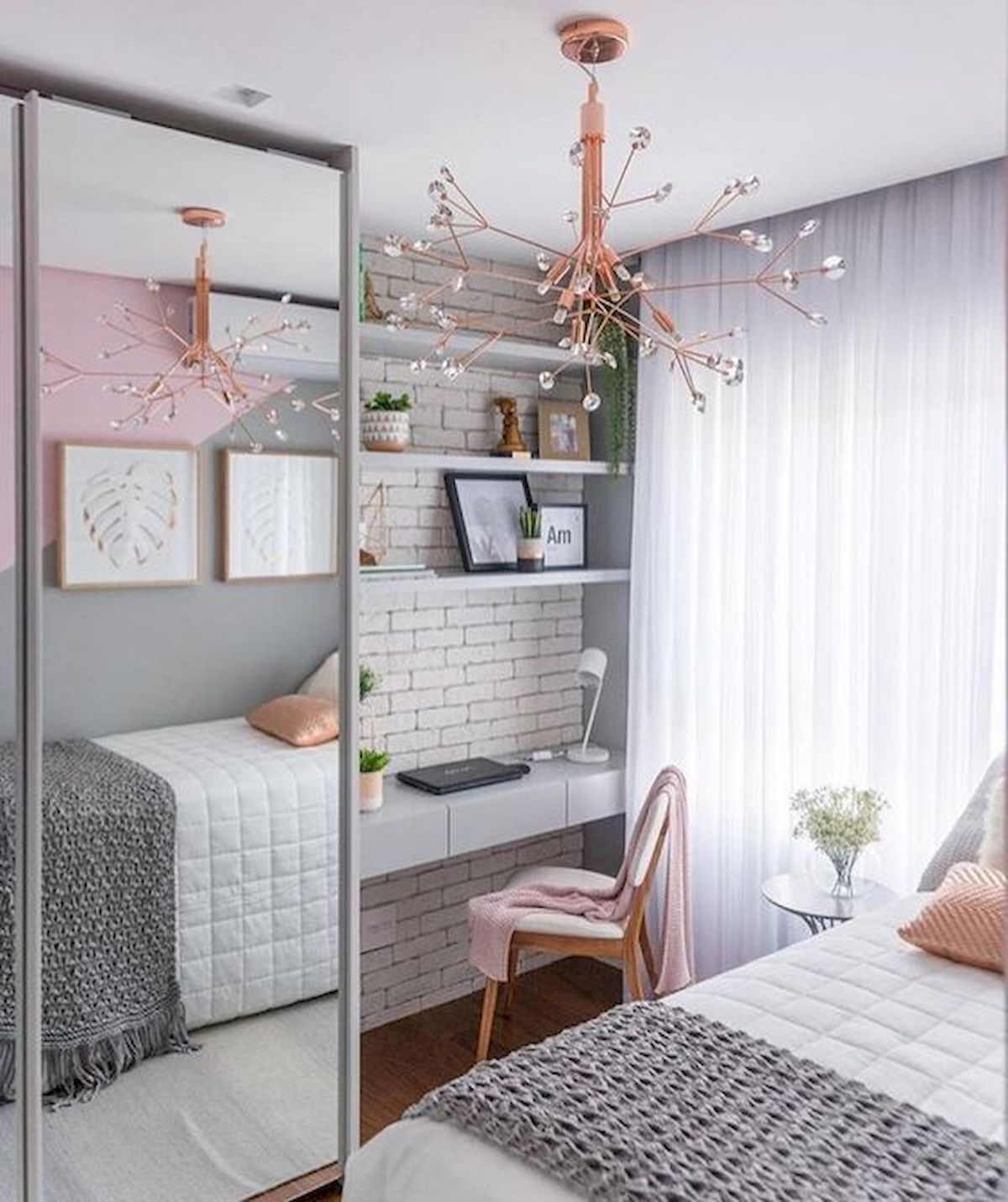 Nu uita de trucul oglinzii, deci asigură-te că dulapul pentru haine dispune de una sau, dacă nu vei putea așeza dressingul în interiorul camerei, montează o oglindă mare pe unul dintre pereți. Vei obține un efect de mărire al spațiului.