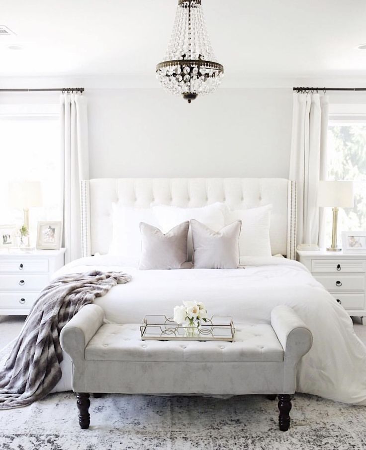 Patul, elementul central, poate fi evidențiat prin montarea unui baldachin discret și prin alăturarea mai multor perne cu modele diferite sau uni, dar care să se împletească cu restul designului.