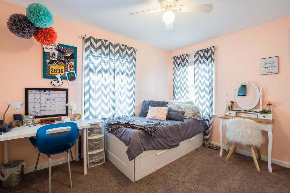 Imprimeurile florale, culorile vii și elementele geometrice se îmbină pentru a crea un dormitor amenajat pentru fetițe. Un spațiu în care să existe o măsuță de toaletă cu o oglindă este potrivit pentru o domnișoară. Asigură-te că așezi pe unul dintre pereți câteva tablouri cu mesaje drăguțe sau imagini feminine, cu prințese și inimioare.