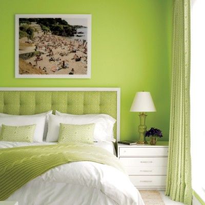 La fel ca în cazul dormitorului albastru și verdele reprezintă o culoare optimă pentru a amenaja acest spațiu pentru că dispune atât de elemente calde cât și reci. Nuanțele pale vor fi preferate de cei care își doresc o atmosferă relaxantă în camera de odihnă. În funcție de intensitatea culorii poți combina verdele cu nuanțe de maro, galben sau portocaliu și nude sau alb.