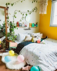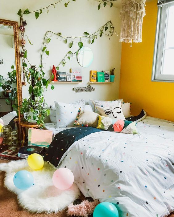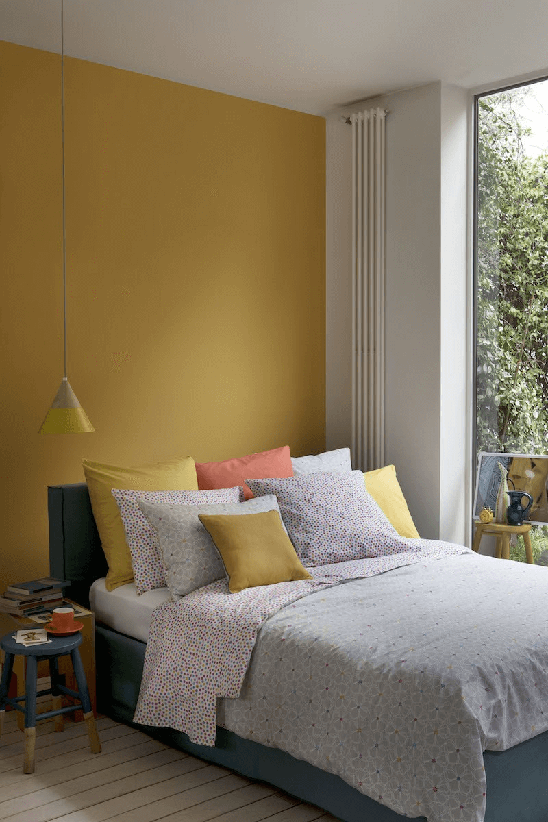 Decorează în culori vesele dormitorul și folosește accentele pernelor sau cuverturii pentru a reda o energie bună încăperii.