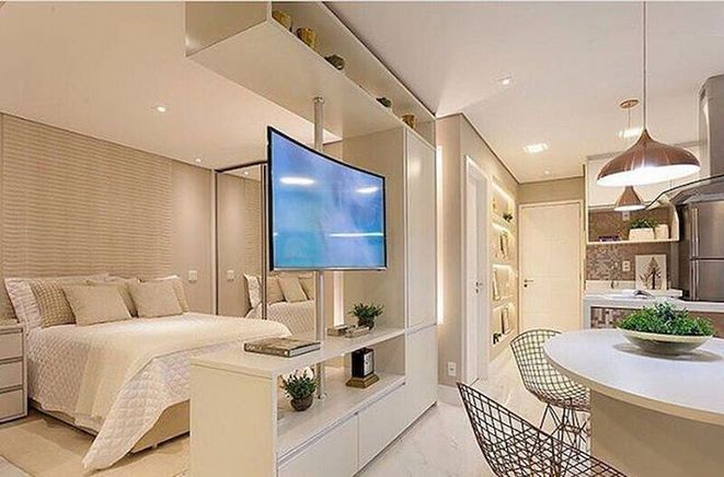 Dacă ai la dispoziție dimensiunea unei garsoniere și îți dorești să îmbini atât spațiul de odihnă cât și pe cel de relaxare, încearcă să împarți încăperea în două zone, pe care să le delimitezi cu ajutorul unor rafturi sau al unei perdele ori un paravan.