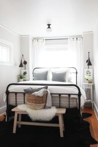 Un dormitor cu dimensiuni reduse va încuraja mobilierul minimalist, culorile deschise și neutre și accesorizarea cât mai puțină pentru a nu aglomera încăperea. Cu toate că trebuie să optezi pentru cât mai puține elemente, patul trebuie să reprezinte piesa centrală care să îți asigure odihna prin dimensiune și calitate. Măsoară înainte modelul preferat pentru a știi cât spațiu rămâne și pentru restul mobilierului. Este indicat să alegi un pat care dispune de sertare laterale, ladă sau spații de depozitare. De asemenea, plasarea patului ar trebui să se facă pe una dintre laturile dormitorului, la perete, astfel creând spațiu și pentru restul pieselor de mobilier.