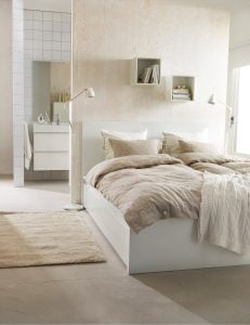 Cuvertura și lenjeria de pat ar trebui să păstreze aceleași nuanțe pale de gri, alb, roz sau bej, deschise la culoare pentru a păstra simplitatea amenajării și un design minimalist.