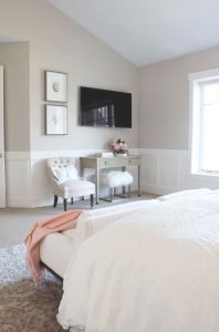 În privința culorilor, dormitorul ar trebui să conțină tonuri pământii și pale (gândește-te la fildeș, piersiciu, coral și ciocolatiu), precum și la culori liniștitoare precum albastrul pal și verdele palid.