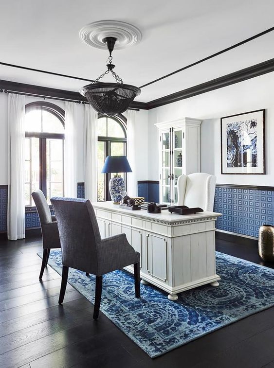 Plintele și brâurile colorate, accentele decorative de pe pereți și detaliile de pe tavan transformă aceste trei birouri în unele realmente magice. Nici nu mai e nevoie de alte decorațiuni.