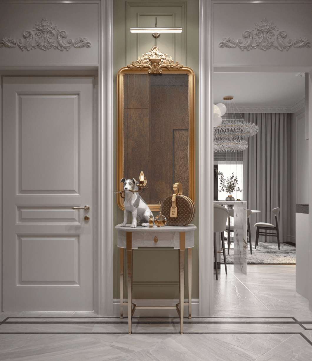 În apartamentul de mai jos spațiul nu este unul generos, și totuși aspectul apartamentului este unitar și luxury în același timp. Luxul poate fi accesibil, atât timp cât îl creionăm cu ajutorul instrumentelor potrivite. Putem remarca simplitatea designului și eleganța desăvârșită a acestuia – cromatica rezervată, accentele metalice, lipsa imprimeurilor încărcate fac din acest apartament mic unul ancorat în viziune estetică. De asemenea, accentele decorative de pe pereți și ancadramentele par să ducă spațiul la un alt nivel – îl transformă din banal în rafinat și elegant.