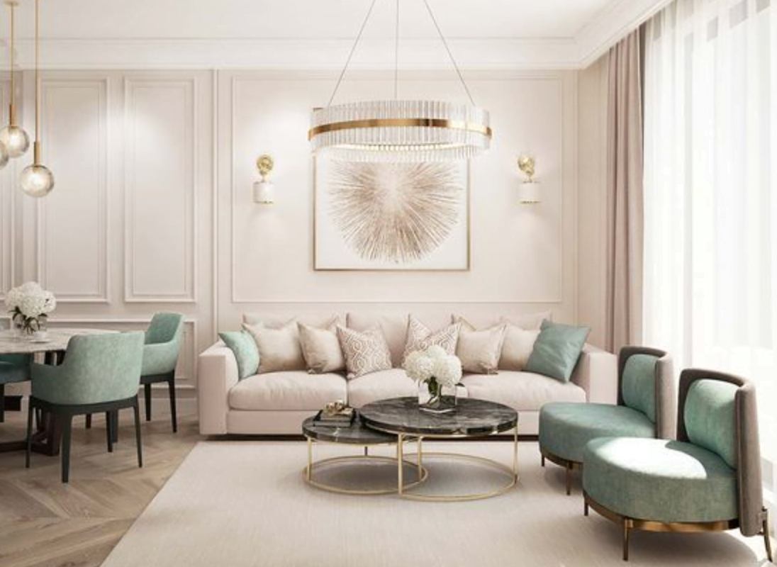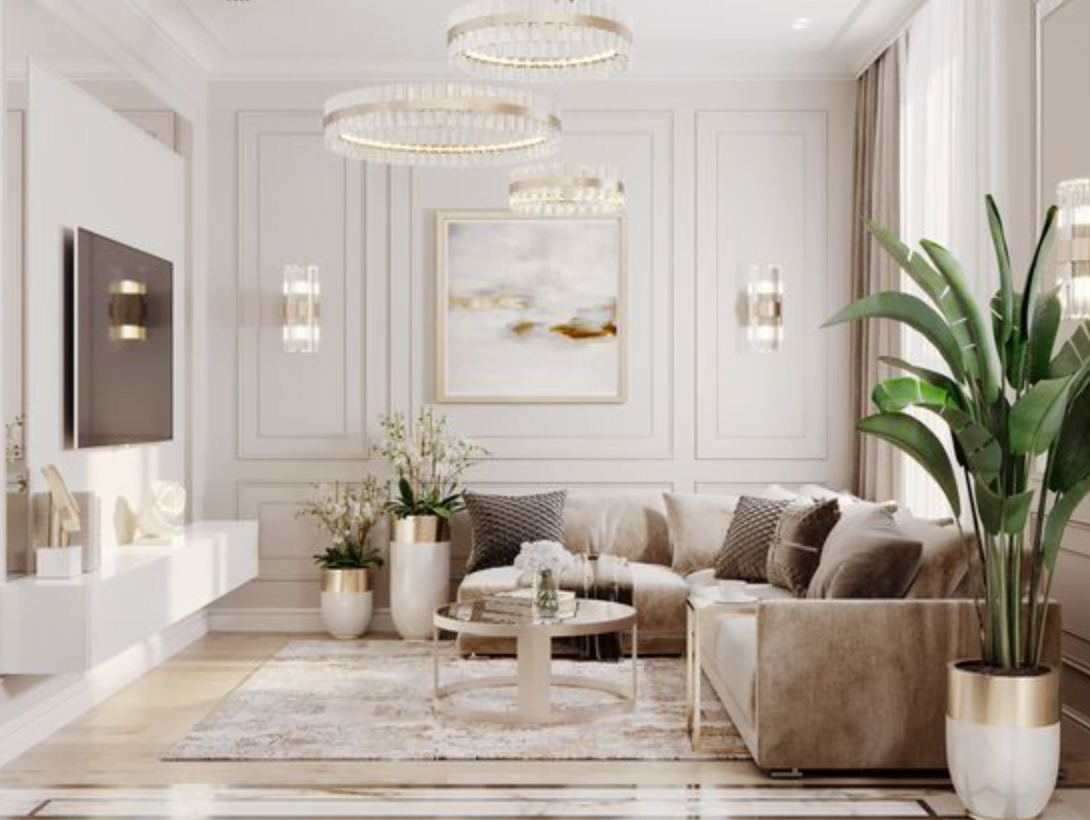 Livingul de mai jos este unul de dimensiuni medii, și cu toate acestea ne „păcălește” ochiul, pentru că pare mult mai spațios decât e în realitate. Iluzia de dimensionalitate este datorată culorilor deschise și abundența de lumină, dar și datorită ancadramentelor decorative de pe pereți – acestea fac încăperea să pară mai mare, mai luminoasă, dar și mai elegantă, pentru că pare sustrasă dintr-un conac clasic și elegant al epocilor trecute.
