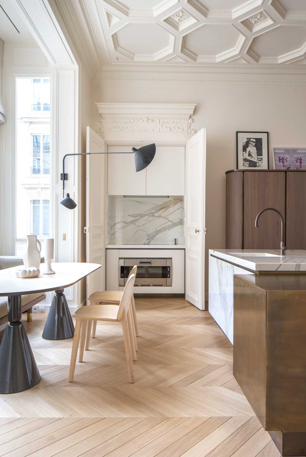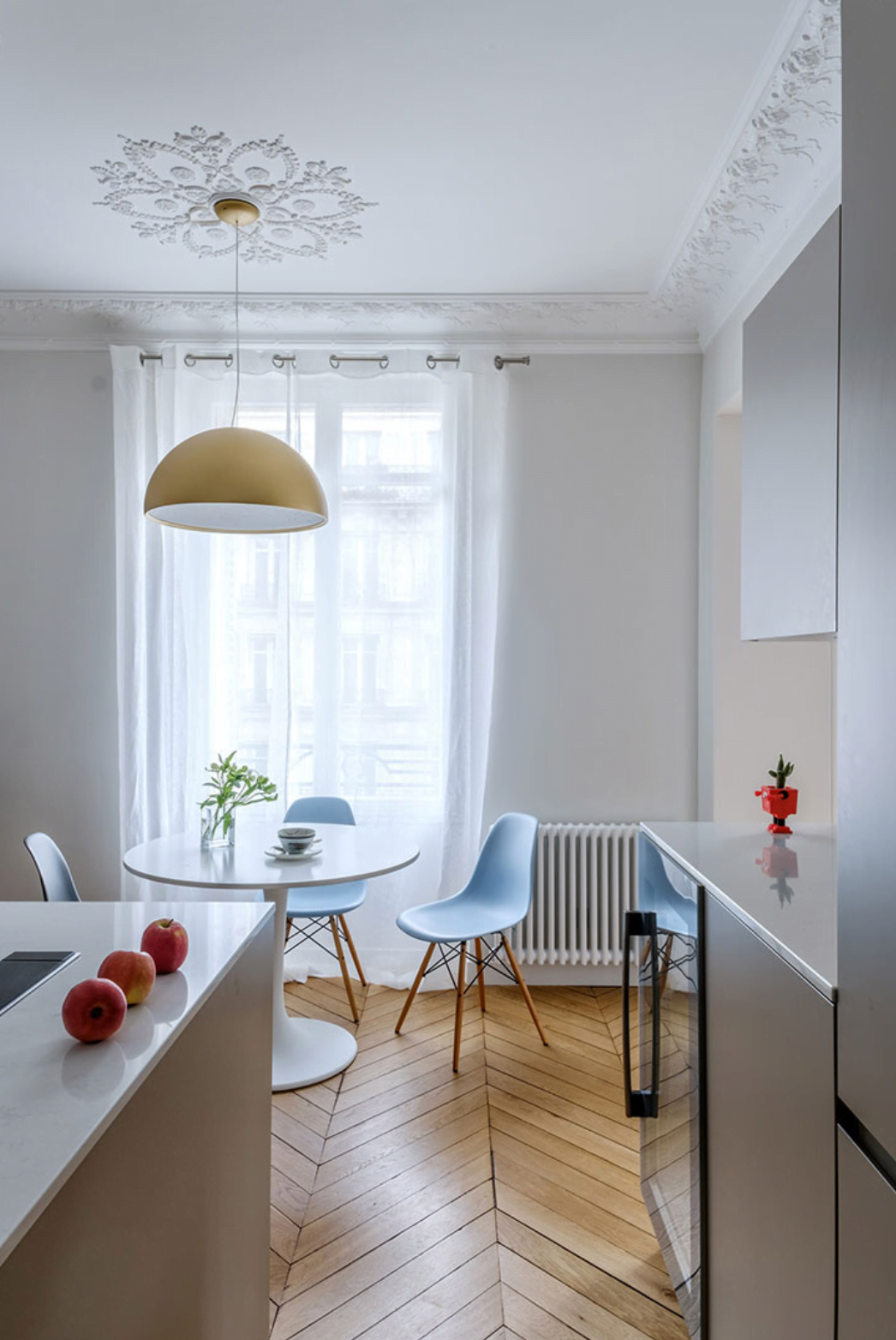 Bucătăriile de mai jos sunt unele tipice pentru un apartament de mici dimensiuni – cu o gamă cromatică neutră, fără imprimeuri încărcate, bucătăria abundă în profile arhitecturale care le oferă un aspect rafinat și modern. Cornișele, rozeta de plafon și tavanul decorativ sunt singurele accesorii de sine-stătătoare de care au nevoie aceste bucătării moderne, amenajate cu bun-gust și cu un buget accesibil.