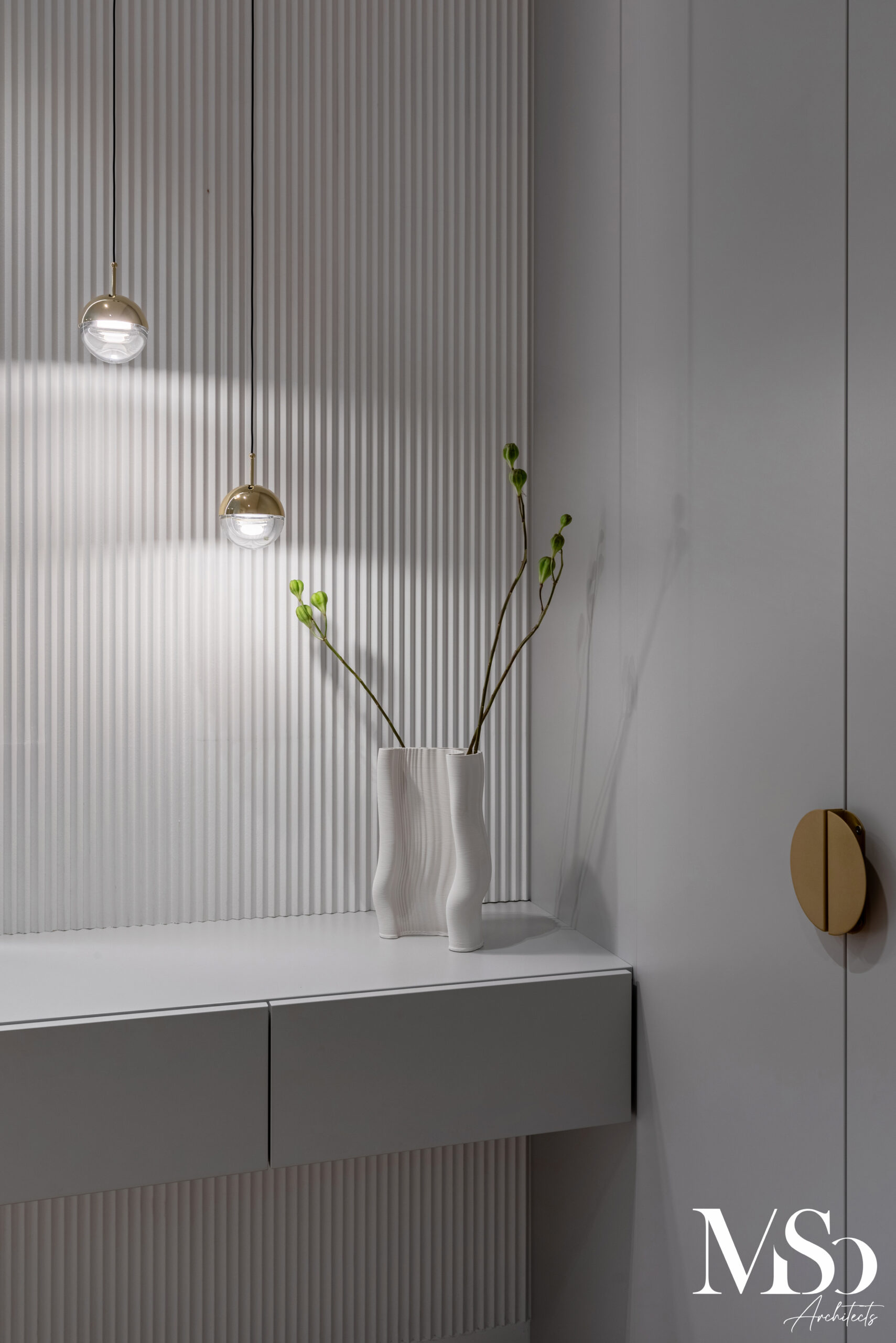 Un element estetic comun în mai multe spații este reprezentat de placările riflate. Placările oferă un anumit ritm și vibrație, care amintește de mișcarea valurilor mării. Această vibrație se regăsește și la placarea insulei de bucătărie, la abajurul din fetru al suspensiei centrale din living, dar și în unduirea perdelelor.