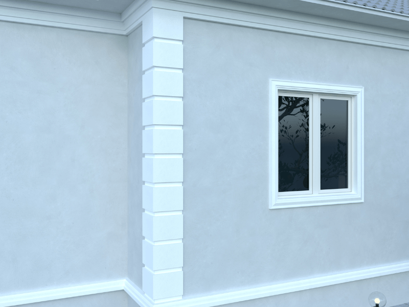 Realizat din EPS100 cu strat de rășină minerală, modelul suportă fără probleme variații de temperatură, umiditate, îngheț–dezgheț și radiații UV. Dimensiunea de 1000 × 35 × 250 × 250 mm îl recomandă pentru fațade ample, unde este nevoie de un efect vizual continuu și de protecție reală a zonelor expuse. Montajul este rapid: RAPM700 pentru lipire, RAPM600 pentru îmbinare și RAPM500 pentru chituire — rezultatul fiind o muchie perfectă, fără rosturi vizibile.