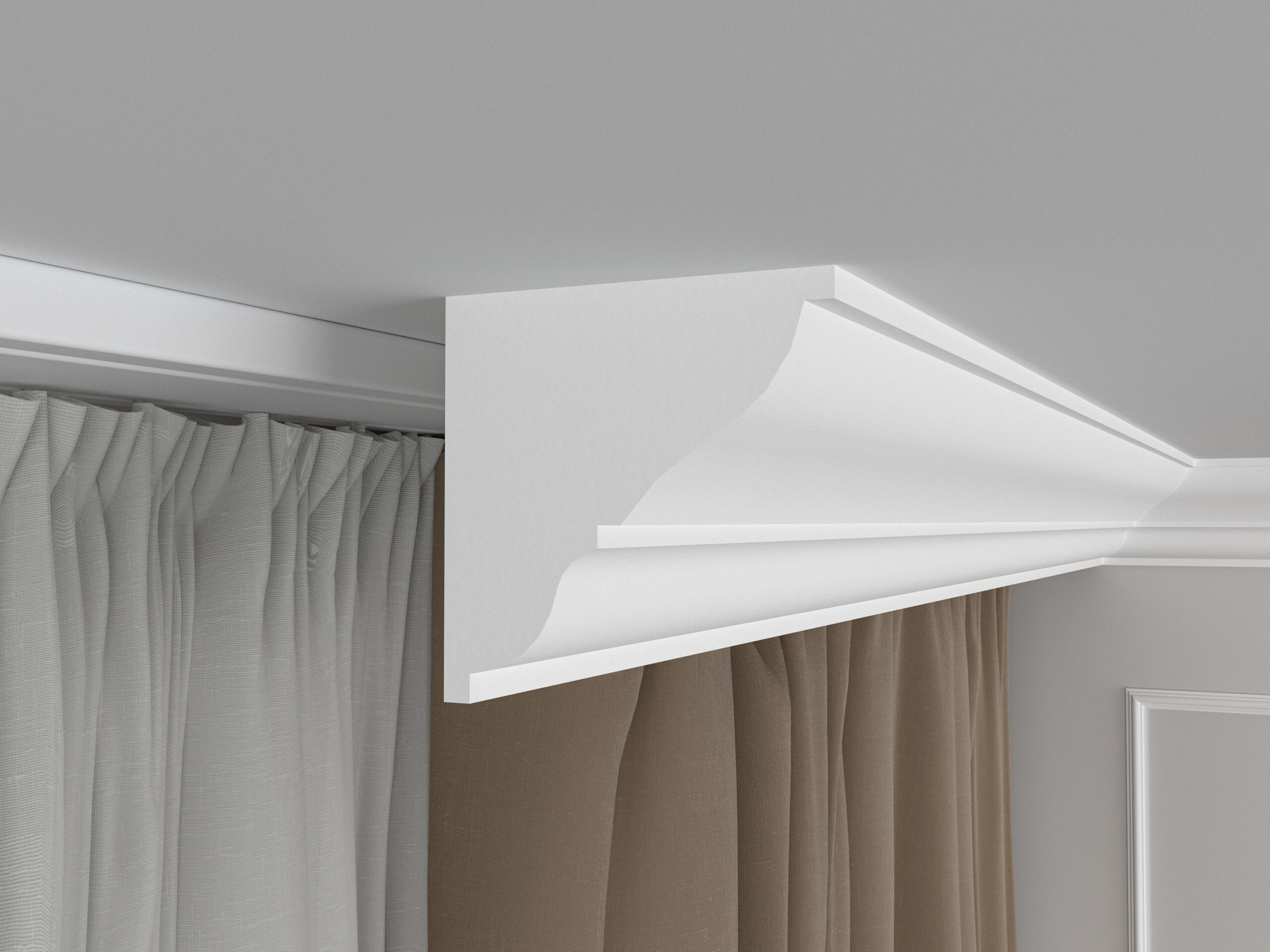 Fabricată din polistiren extrudat XPS, cornișa este ușoară, rezistentă la umiditate și poate fi vopsită cu lavabilă sau acrilică pentru a se integra complet în nuanța tavanului sau pentru a contura subtil zona ferestrei. Materialul stabil și finisajul neted o fac potrivită pentru proiecte de renovare, amenajări moderne sau interioare care pun accent pe linii curate și continuitate vizuală.